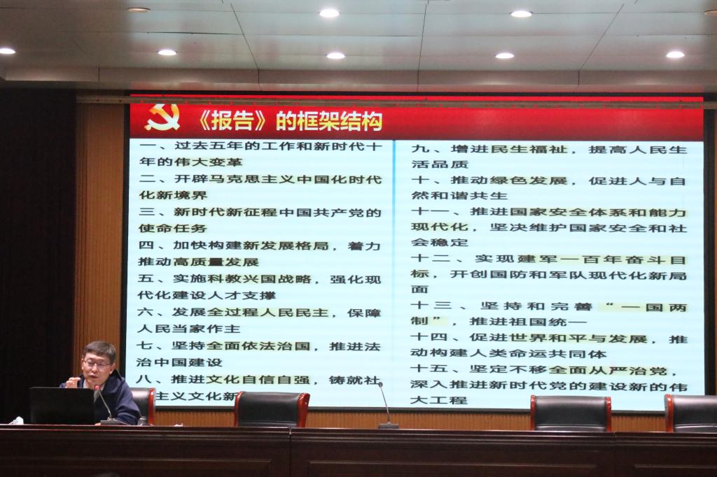会上,党委书记秦昌盛介绍了党的二十大的概况,对党的二十大报告的框架结构及主要内容进行了领学,并对学院未来学习党的二十大精神的工作进行部署安排,从活动阶段、活动主题、主要内容、时间等方面对2022年度“学习宣传贯彻党的二十大精神”周工作推进表进行了详细讲解。
