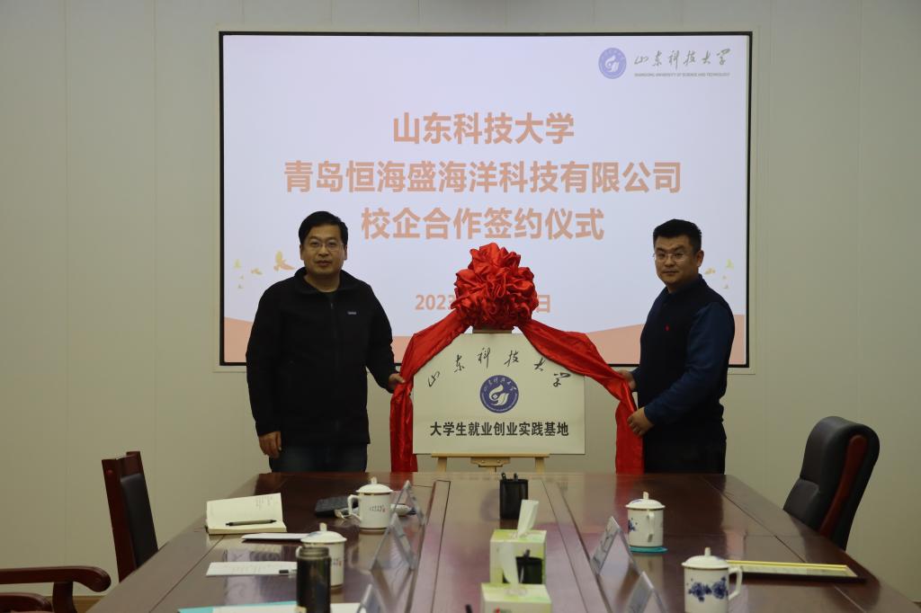 副院长王瑞富和青岛恒海盛海洋科技有限公司总经理宋大鹏共同为“大学生就业创业实践基地”揭牌。