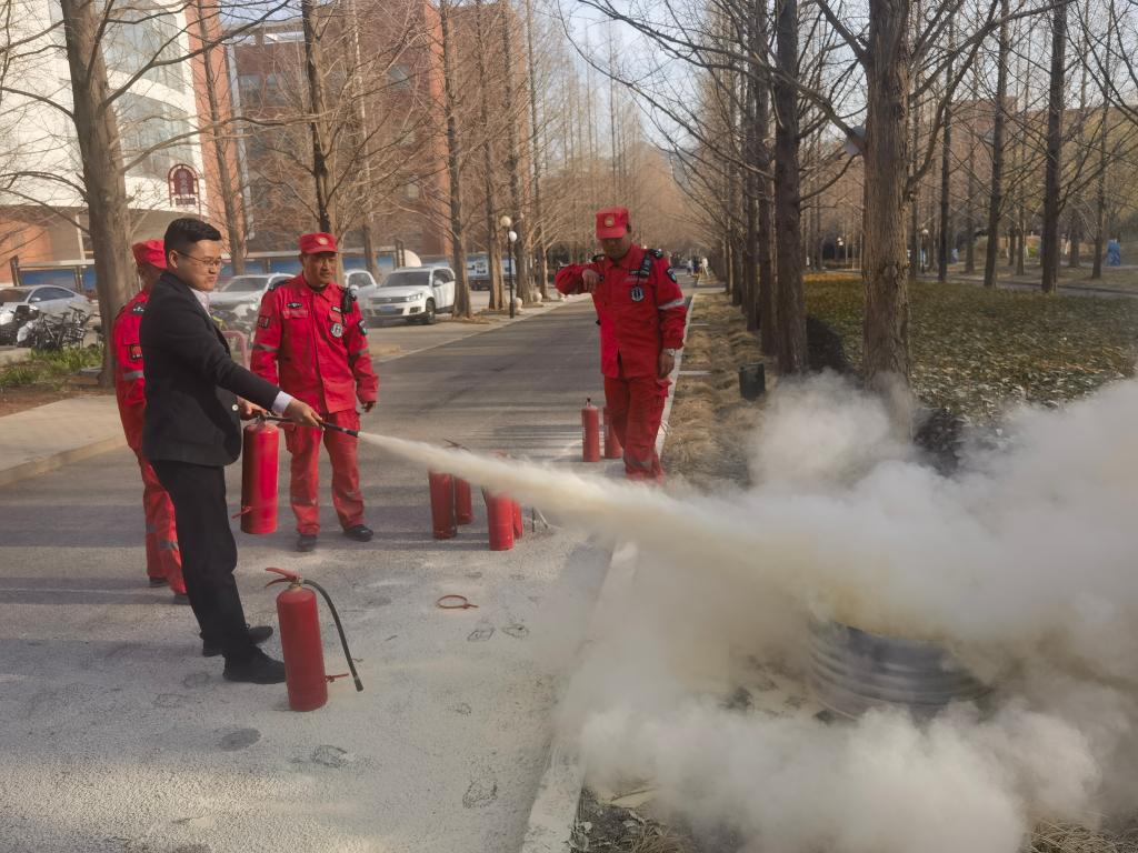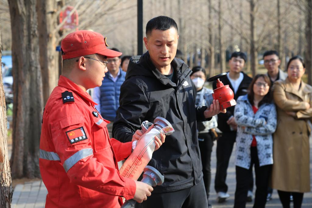 随着疏散撤离工作的完成,师生们集体来到了J14南侧进行灭火培训和消防实战练习。讲解员详细介绍了火情出现时的应急处理流程,展示了手提式干粉灭火器和消火栓的正确操作方法,师生们纷纷前去尝试,并进行了实战演练。