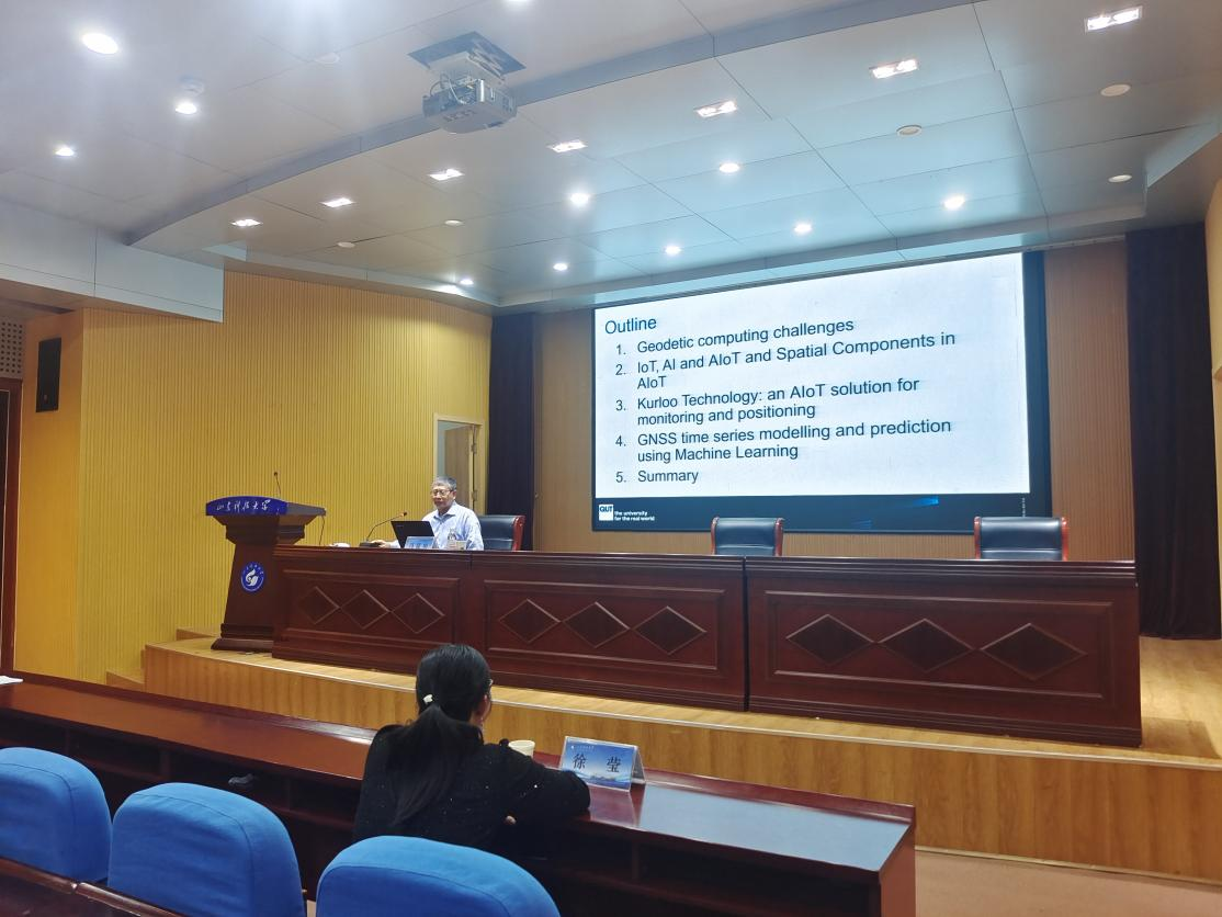 冯延明教授长期从事无线移动网络、网络安全、工程和信息技术研究方法等学科的教学工作,曾任《全球定位系统学报》主编,并连续担任中国卫星导航学术年会海外分会主席。冯延明教授从大地测量计算挑战,LOT、AI、AIOT中的空间分量,Kurloo技术用于监控和定位的ALOT解决方案,基于机器学习的GNSS时间序列建模与预测等方面进行介绍,讲述了当前GNSS数据处理的研究现状、面临的问题和挑战,以及如何与AI、物联网结合应用等问题,整个报告生动形象,引人入胜。报告最后,冯延明与师生们进行了现场交流,对大家的提问做出了详细解答。