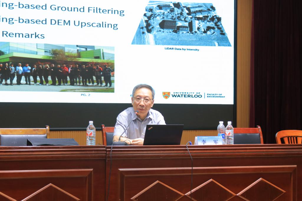 在报告中,李军教授详细介绍了机载激光扫描(ALS)技术在洪水测图领域的可行性,构建了基于全球不同国家数据的超大规模地面滤波数据集,评价了深度学习技术在洪水测图中的精度及评价分析,同时指出了将现有三维深度神经网络推广到地面滤波任务中所面临的挑战。此外,他还针对与会者提出了一些未来研究的方向建议,并现场回答了师生提问。