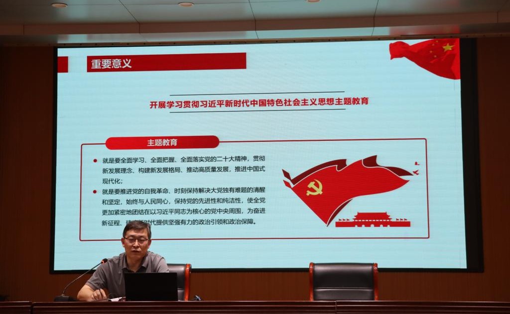 会上,秦昌盛围绕“深入学习贯彻新思想,科学推动高质量发展”这一主题,从“主题教育重要意义和主要内容”、“习近平新时代中国特色社会主义思想的鲜明特质”、“学习贯彻党的二十大精神踔厉奋进新征程”等方面进行讲授,对教职工扎实学好习近平新时代中国特色社会主义思想提出要求。
