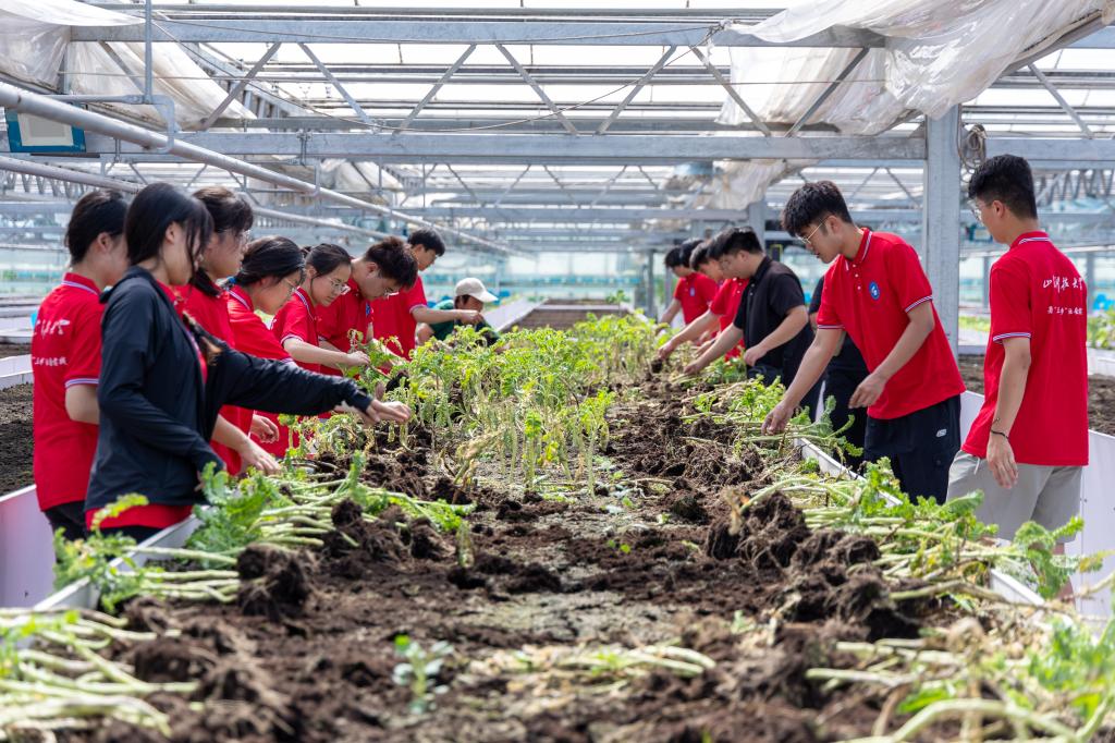 随后,团队成员们前往农业大棚进行实地探访,参与农业劳动,体验现代农业技术的应用,深刻体会到了农民们日常劳作的艰辛与不易。他们不仅仔细观察了大棚内的种植布局和现代农业技术的应用,还积极投入到实际劳动中,帮助农民们采摘羽衣甘蓝,为农作物除根,并修建西红柿的枝叶,大家通过一系列的农业操作,感受到了劳动的魅力。