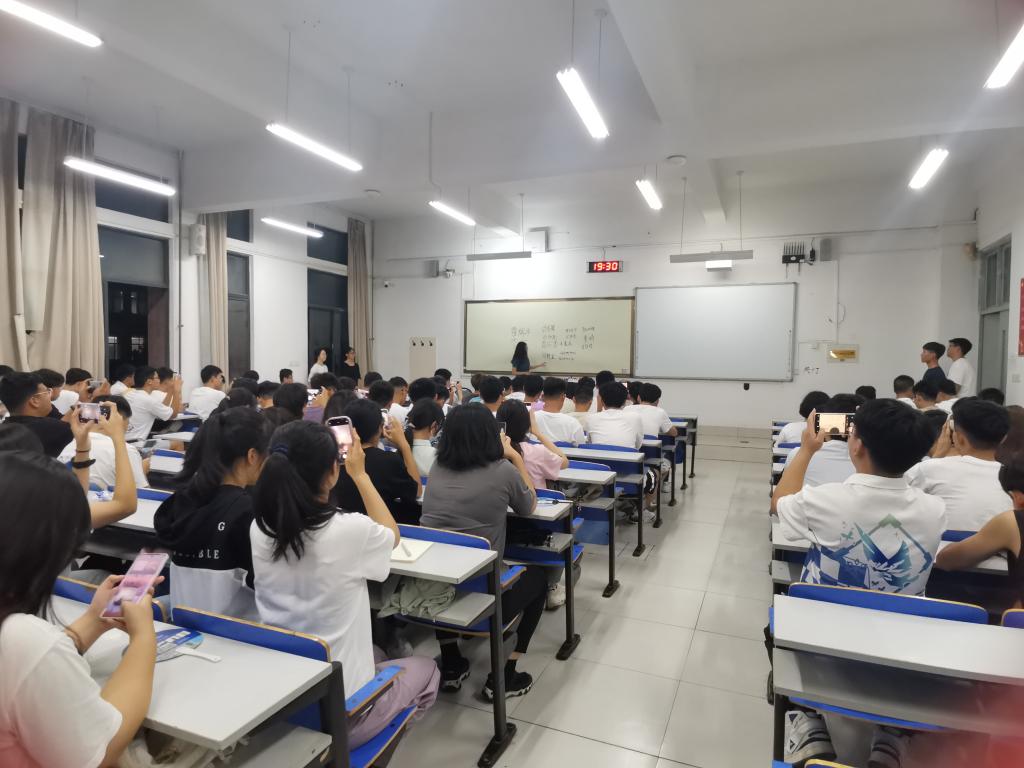 9月4日晚上,辅导员周静宜、牛盛光和20名兼职辅导员分专业、班级为新生开展了“大学第一课”。周静宜用风趣幽默的话语,通过鲜活的案例,引导新生在大学期间要讲文明、懂礼貌,从身边的小事做起,做一个有“爱”的大学生。牛盛光带着新生进行了自我介绍与才艺展示,让新生在愉悦的氛围中快速熟悉彼此。