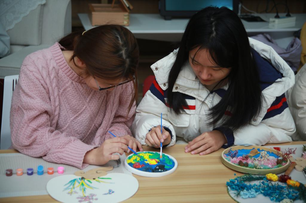 活动共分为三个环节,第一环节为“一苔一画”,同学们自愿分组,将苔藓、小船、小桥等材料跟随心情粘贴在画板上,并随之涂上喜欢的颜色,充分发挥无限想象力,构造出一幅幅美丽大方、精美典雅的苔藓画;第二环节为“巧手绘物”,同学们根据自己的喜好,选取不同的石膏模板进行创作,将不同的颜色覆盖在模板上,赋予石膏盘、石膏娃娃独一无二的色彩和纹样。制作过程中,同学们互相帮助、互相分享,整体氛围轻松愉悦;第三环节为“制扇至美”,活动现场提前为同学们准备好空白团扇、干花、胶水、丙烯颜料等材料,让同学们充分发挥自己的想象力,自己动手DIY团扇,在裁剪、贴花、绘画的相互融合中,一把把精致美妙的团扇脱颖而出,展示独特风采。