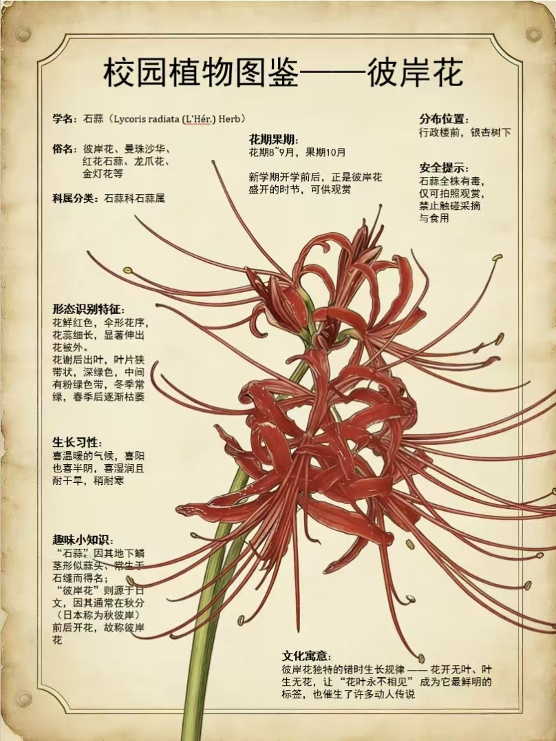 本次活动以植物图鉴卡形式征集作品,参赛同学围绕植物名称、科属分类、形态特征、生长习性、校园分布位置等内容进行设计,并结合原创摄影、手绘作品等视觉素材完成创作。作品征集结束后,研究生会依据主题契合度、创意性、完成度美观度、记录完整性等多个维度进行综合评审,最终评选出一等奖3名、二等奖10名、三等奖17名。