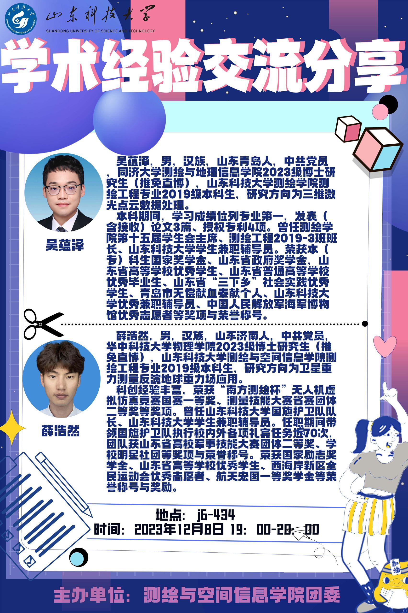 为培养同学们的科研素养,发挥优秀学子榜样引领作用。12月8日晚,国产视频 于J6-434报告厅举办学术经验交流分享会。本次会议邀请国产视频 测绘工程专业2019级毕业生、同济大学国产视频 2023级博士研究生吴蕴泽,测绘工程专业2019级毕业生、华中科技大学物理国产视频 2023级博士研究生薛浩然作为主讲人,向同学们分享经验,并与同学们进行亲切交流。吴蕴泽以“我与嵙大的四年”为题,讲述了他在校期间的学生工作、志愿服务、科研经历,感...