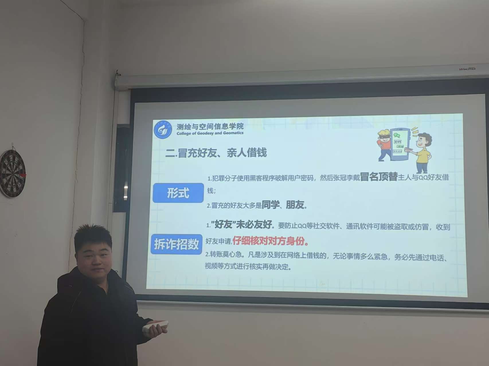 为提高同学们对网络电信诈骗的防范意识,增强防范网络电信诈骗能力。12月18日,国产视频 于J6-457举办“防范网络电信诈骗”主题教育活动。活动开始,辅导员王宏力向2024级主要学生干部普及了网络电信诈骗的常见手法和防范方法。内容涵盖了电话诈骗、网络诈骗、短信诈骗等多种诈骗形式,让同学们对这类犯罪有了更深入的了解。随后,通过真实案例宣传片,让同学们更加直观地了解网络电信诈骗。此次主题教育活动的顺利开展,帮助同...